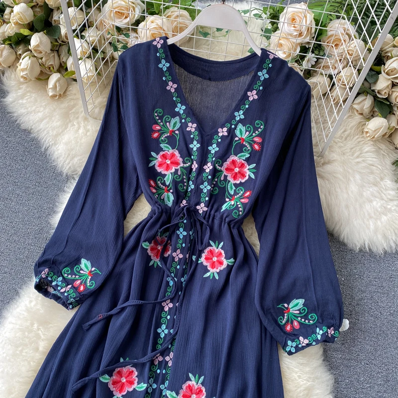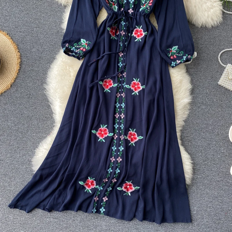 Item Name:Women's Dress Travel Photography Holiday Long Dress 2020 New Retro Ethnic Style Embroidered V-neck Lantern Sleeve Dress ML1034